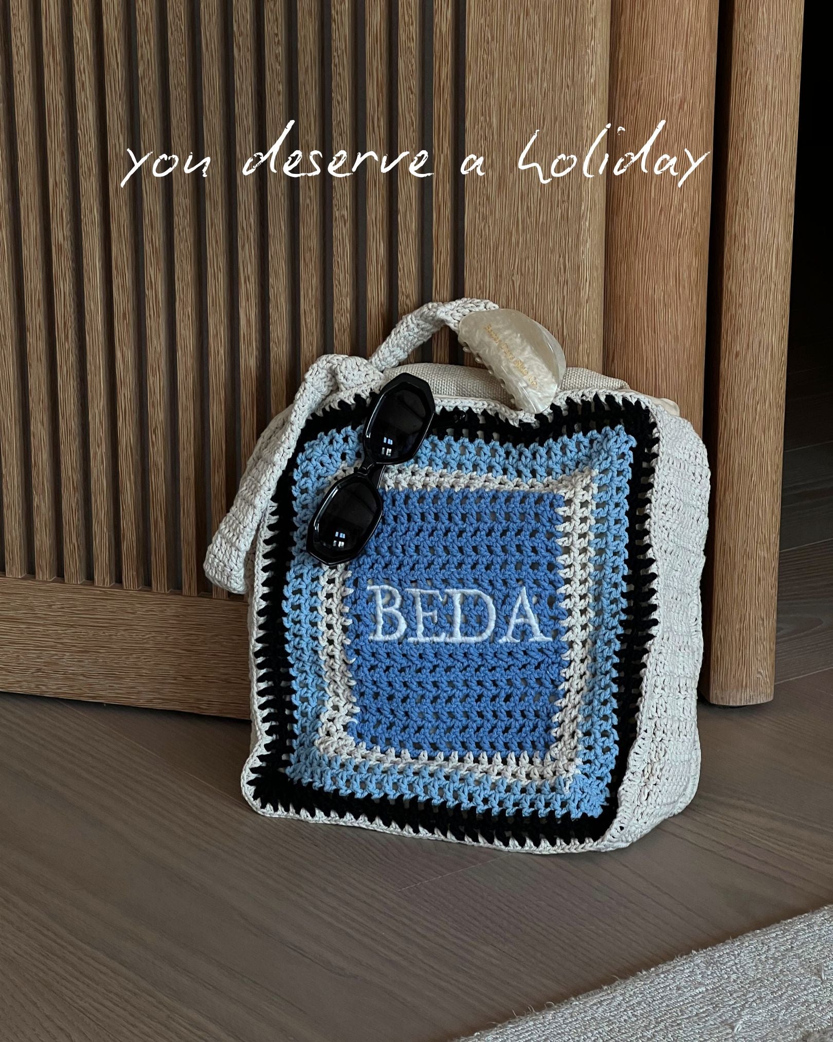 We should go on holiday together. Inspired by our friend's Tuscan wedding and crafted with the creative input of our community, our handcrafted tote features signature Beda blues for a touch of uniqueness. From work to play, this tote effortlessly adapts to any occasion. Stay comfortable and organized with its fully lined interior and padded straps. With its vibrant crochet style, this tote adds a playful touch to your everyday look. Whether it's spring, summer, or autumn, this versatile tote is ready for any season.